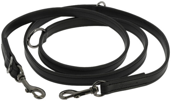 – Made of faux leather-like material. – Versatile with these multiple settings: Equipped with three rings and a snap hook