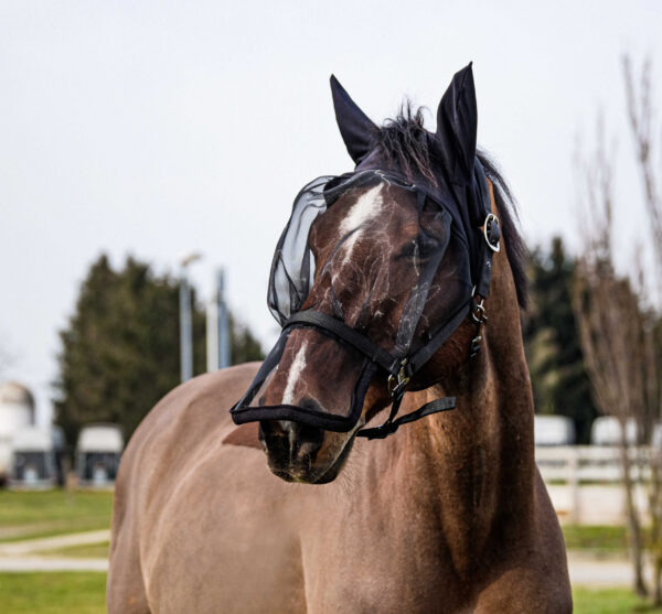 Neoprene-lined polypropylene headpiece, noseband, and noseband bar. Equipped with a cap with Lycra ears. – Made of anti-UV 50 mesh