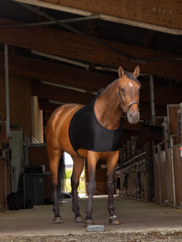 Ensure your horse’s comfort and protection! – Comfortable: Shoulder-high neckline and ultra-stretch fabric. – Durable: Reinforced lining at the back.