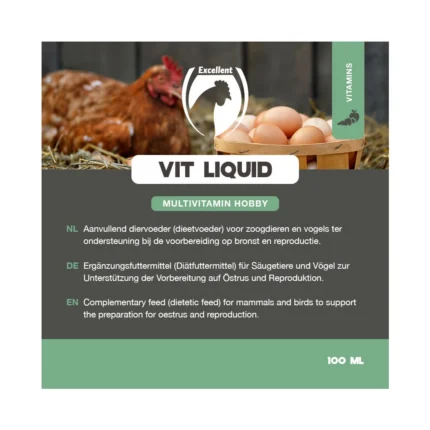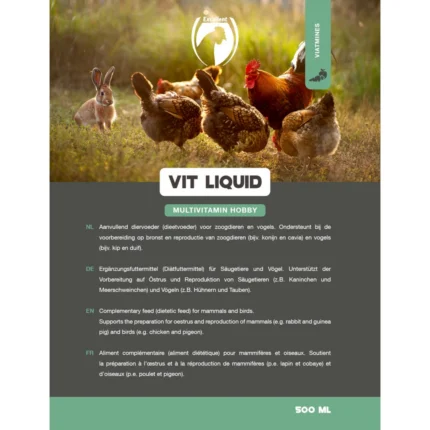 Liquid multivitaminSupports the preparation for oestrus and reproduction of mammels (e.g. rabbit and guinea pig) and birds (e.g. chicken and