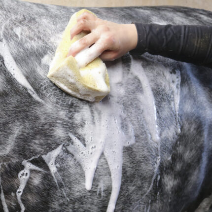 Shampoo for cleaning and conditioning the coat, mane, and tail. This purple-colored shampoo is specially formulated for grey and light-colored