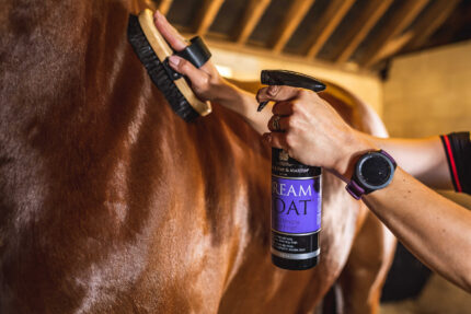 A spray to make the horse’s mane and tail shine and tangle-free. Knots are easier to comb out. Conditions and