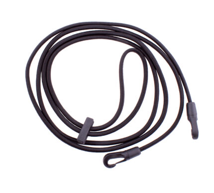 Elastic cord with two plastic clip hooks. Adjustable using a slider placed above the headpiece. Can be used while riding