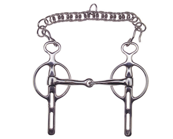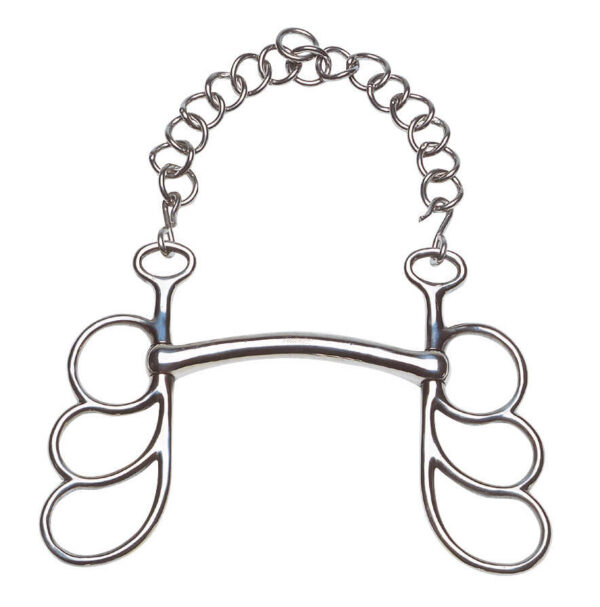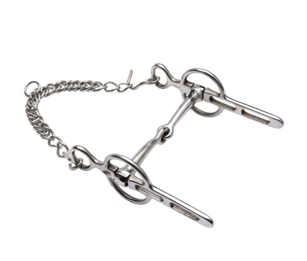 With a wide, padded noseband and English cowhide curb chain. Stainless steel branches.