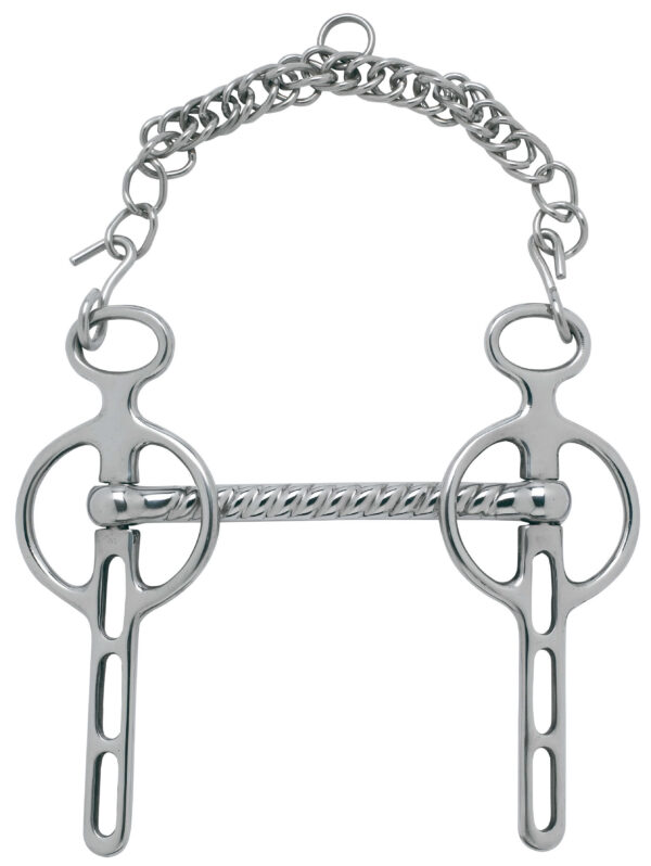 Made of stainless steel with a half-twisted, curved mouthpiece and fixed stirrups. Three rein loops. Sizes 115 and 125: two-hole