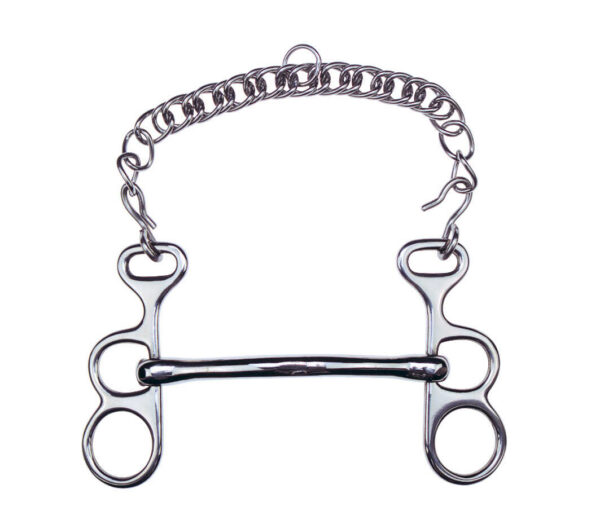 Made of stainless steel with a curved mouthpiece and fixed stirrups connected by a stainless steel bar. Prevents stirrups from