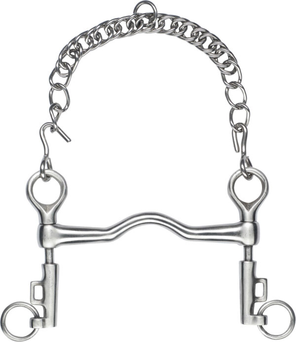 A double-bar bit made of satin-finished stainless steel, with a shank with a slight tongue clearance. The separate mouthpiece and