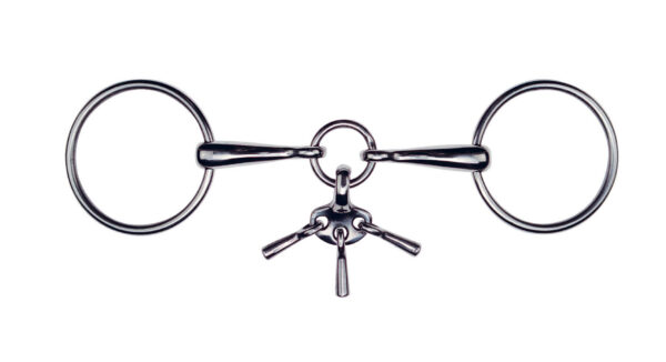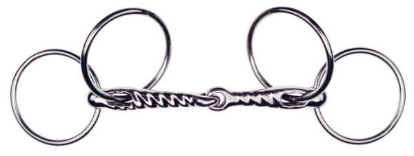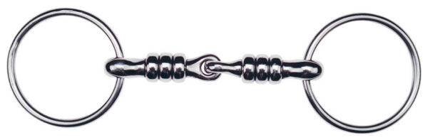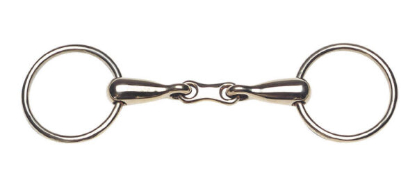 Stainless steel, double-jointed, recommended for horses with a hard mouth but not a pulling mouth. The asymmetrical joint has a