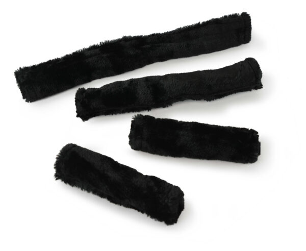 Add a synthetic sheepskin liner to any halter. – Attaches with hook-and-loop fasteners. – Includes a noseband cover, a browband