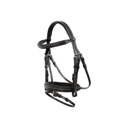 Symmetric bridle with soft padded headpiece. The curved browband is round raised and has a patent leather cover and a