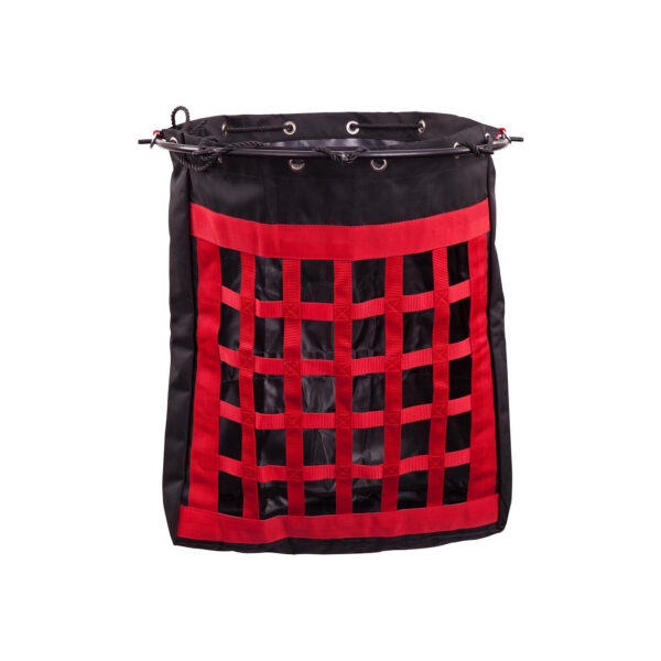 Strong hay bag made of polypropylene featuring a waterproof coating. The front has square webbing, mesh size 5 x 5