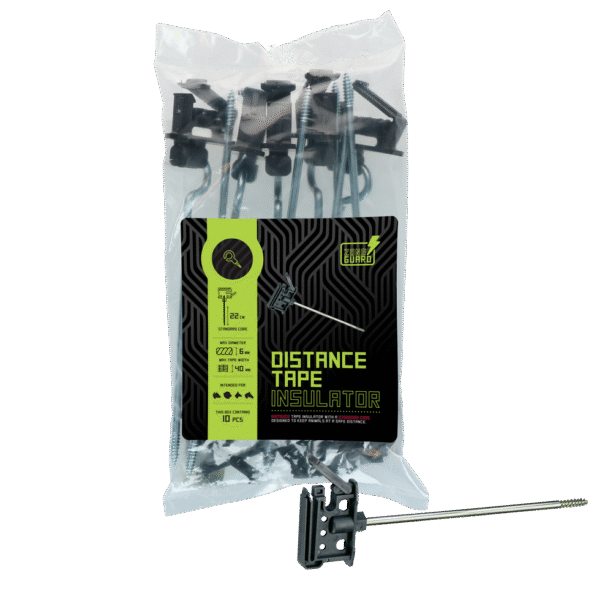 Distance tape insulator  Suitable for thread, cord (6 mm) and tape up to 40 mm. Galvanised support 22 cm.