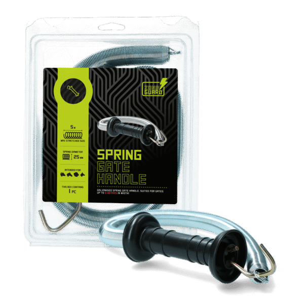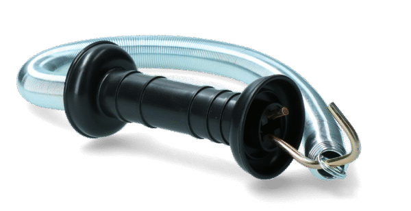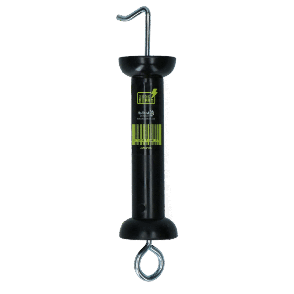 Gate handle for safe pasture access. Strong and durable, with extra-large hook.With tension limiter. Made of galvanised galvanised steel for