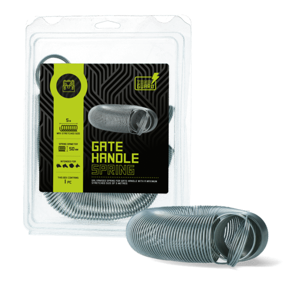 Gate handle with springThe spring with a diameter of 2.5 cm can be stretched up to a length of 5