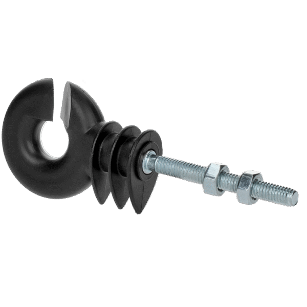 Black bolt isolator. Ring insulator with metal core, for extra strenght.  Designed to fit metal posts. For wire and rope up