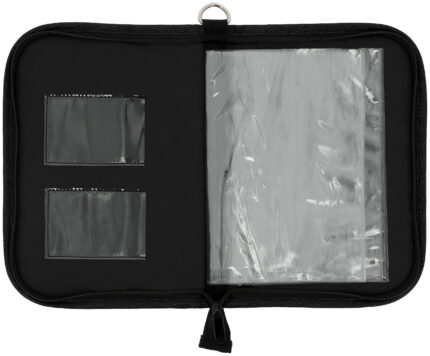 – Made of 600-denier polyester with a fastening ring and full-length zipper. – With transparent PVC pockets and a card