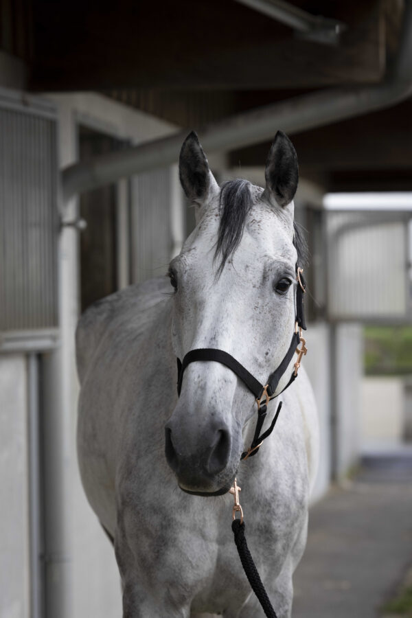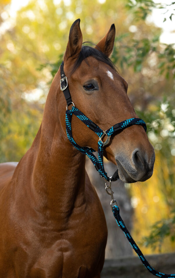 A soft halter and its matching lead. – Adjustable: Adjustable noseband and double adjustment of the headpiece. – Practical: Quick
