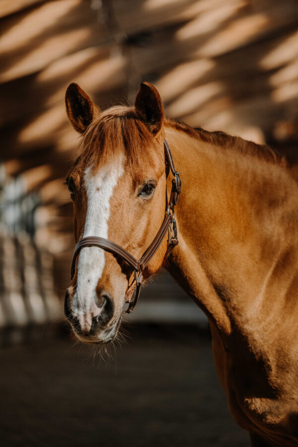 A soft and durable halter for everyday use. – Brass fittings and cream-colored stitching. – Available in Sizes from foal