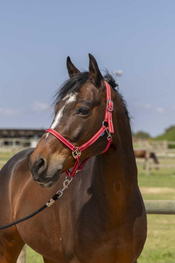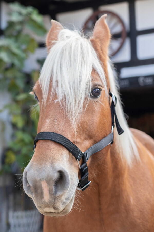 The halter for cold-blooded horses. – Very durable: Made of 3.8 cm wide, three-layer polypropylene. – Practical: Adjustable headpiece with
