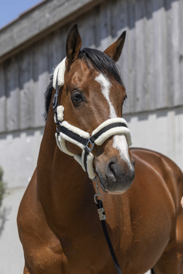 The comfort of synthetic sheepskin. – Lined with 10 pieces of synthetic sheepskin throughout the halter. – Practical: Double adjustment