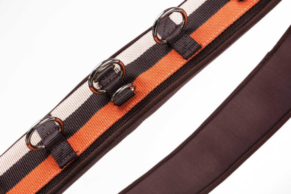 – Comfort: Double layer with buffalo leather padding. – Practical: 5 nickel-plated D-rings on the back for attaching auxiliary reins.