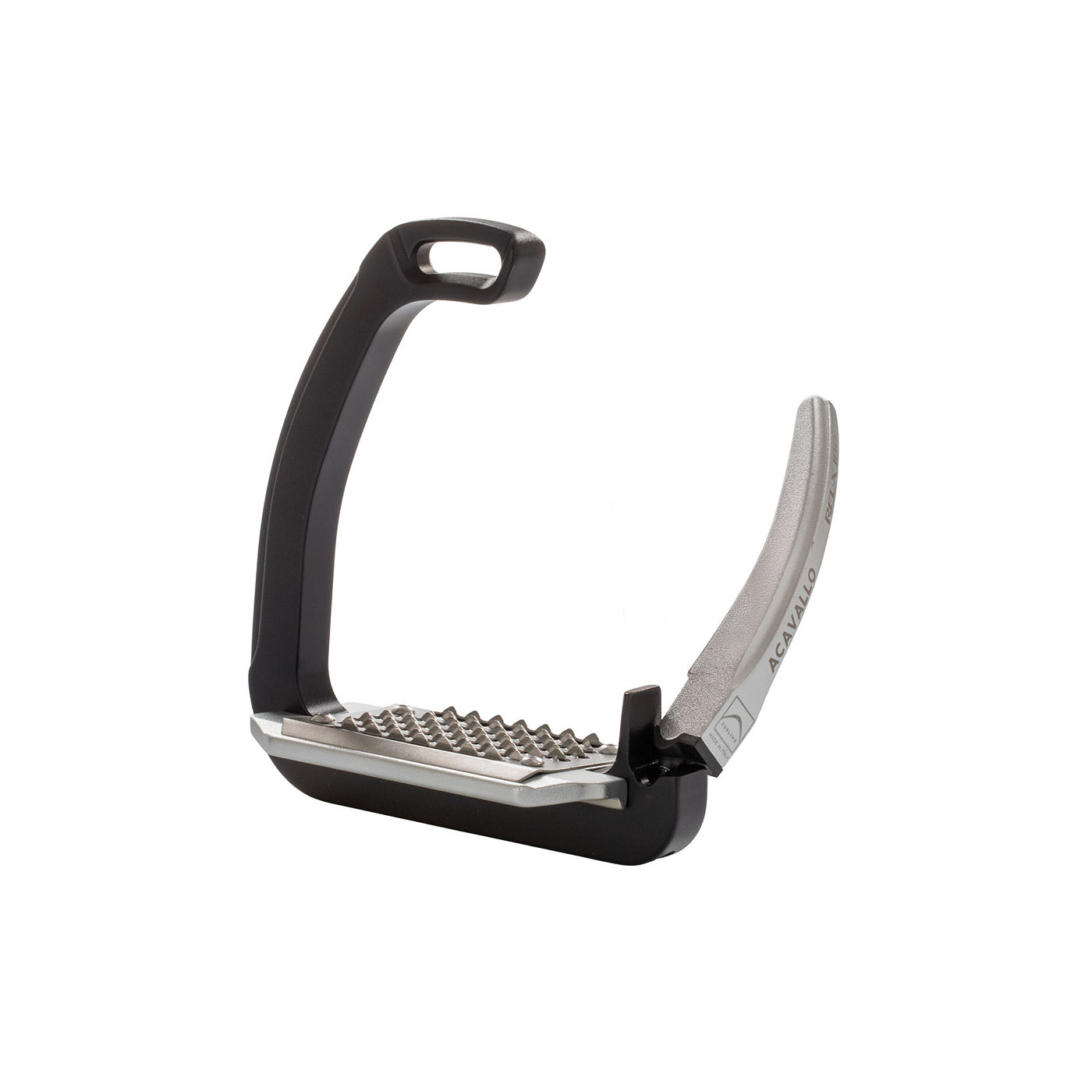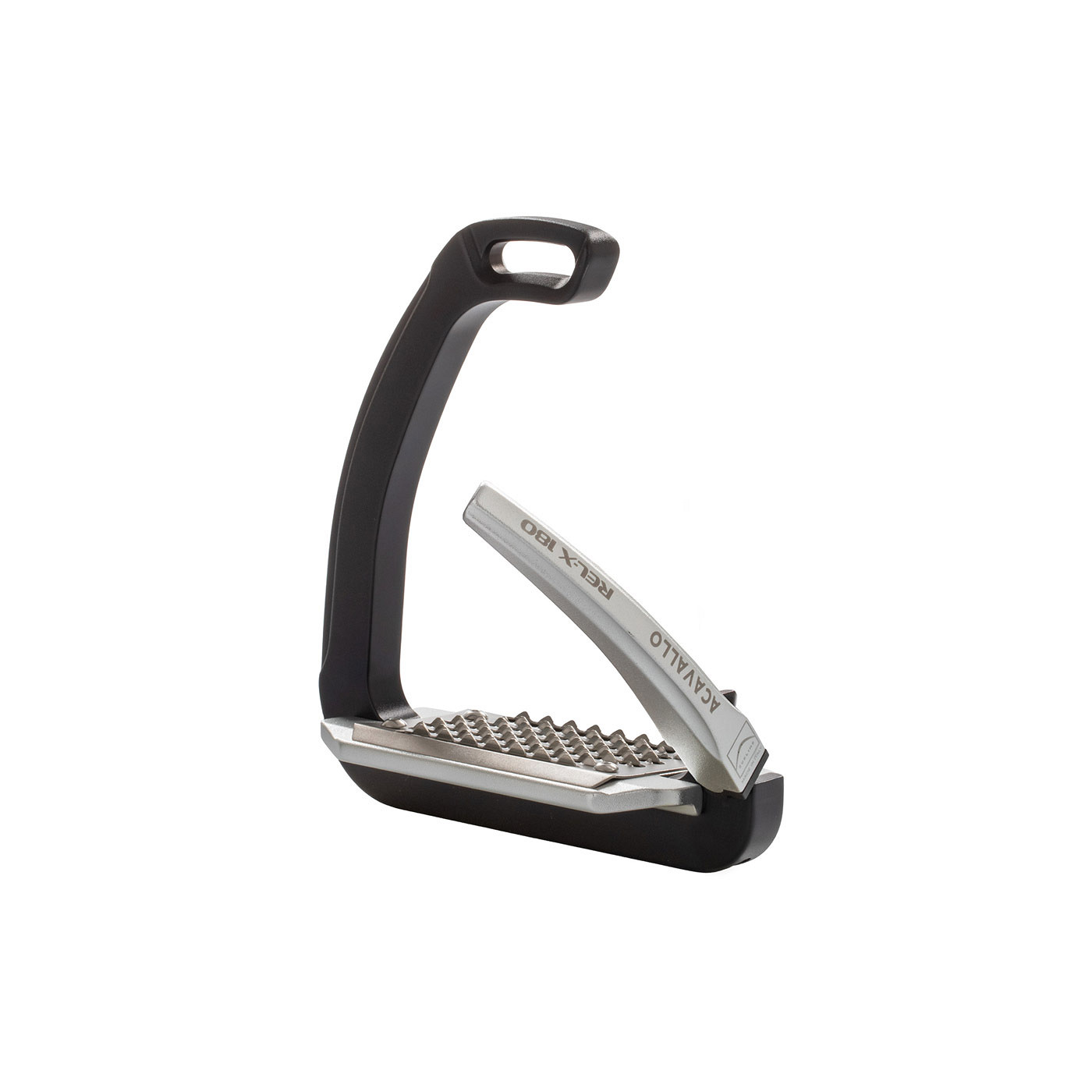 The REL-X 180 stirrups from Acavallo offer optimal comfort and a stable foot position. Sturdy, high-tech metal combined with flexible polymers offer both strength and reduced stiffness. The hinged safety mechanism allows the branch to move 180 degrees forward and backward and 90 degrees outward. The riderโs weight ensures that the hinge opens in the event of a fall. This prevents the foot from getting caught in the stirrup. The stirrups therefore move forward, backward and sideways in the event of a fall.