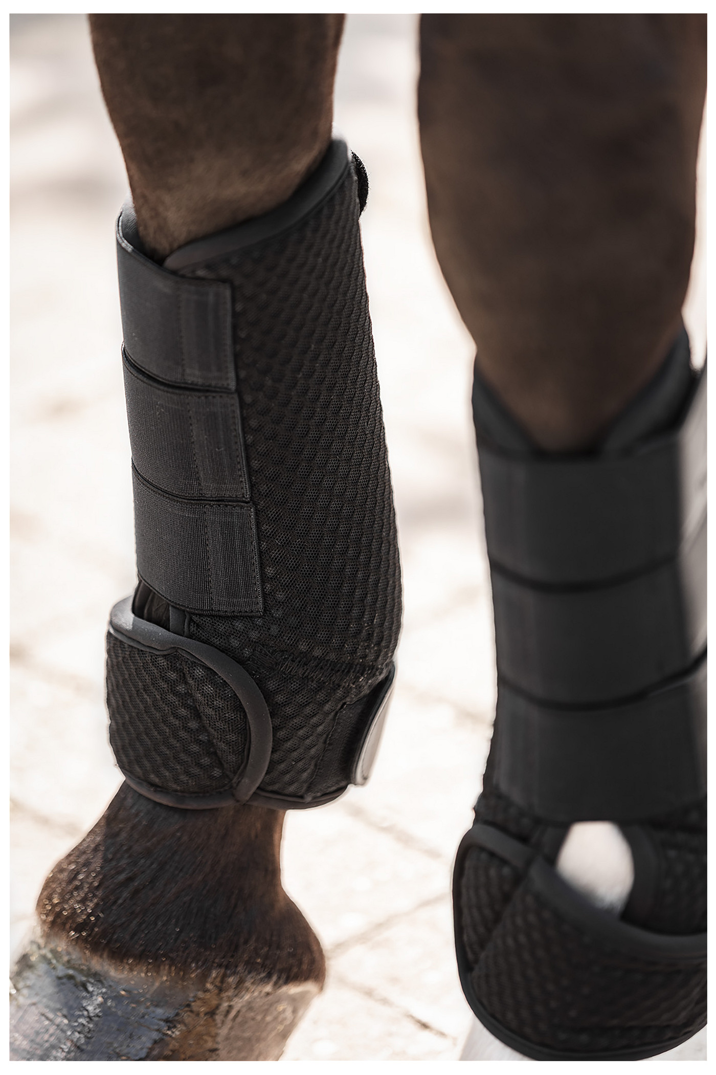 The 3D mesh exterior has multiple layers to optimize the ventilation capacity. The inside is also made of breathable neoprene so moisture and heat are dissipated quickly. Neoprene also has a shock-absorbing effect to ensure that any blows are absorbed. The Velcro fasteners are elastic for a perfect fit and covered at the ends with PU material. The extra-long Velcro closure at the bottom provides extra protection to the fetlock.