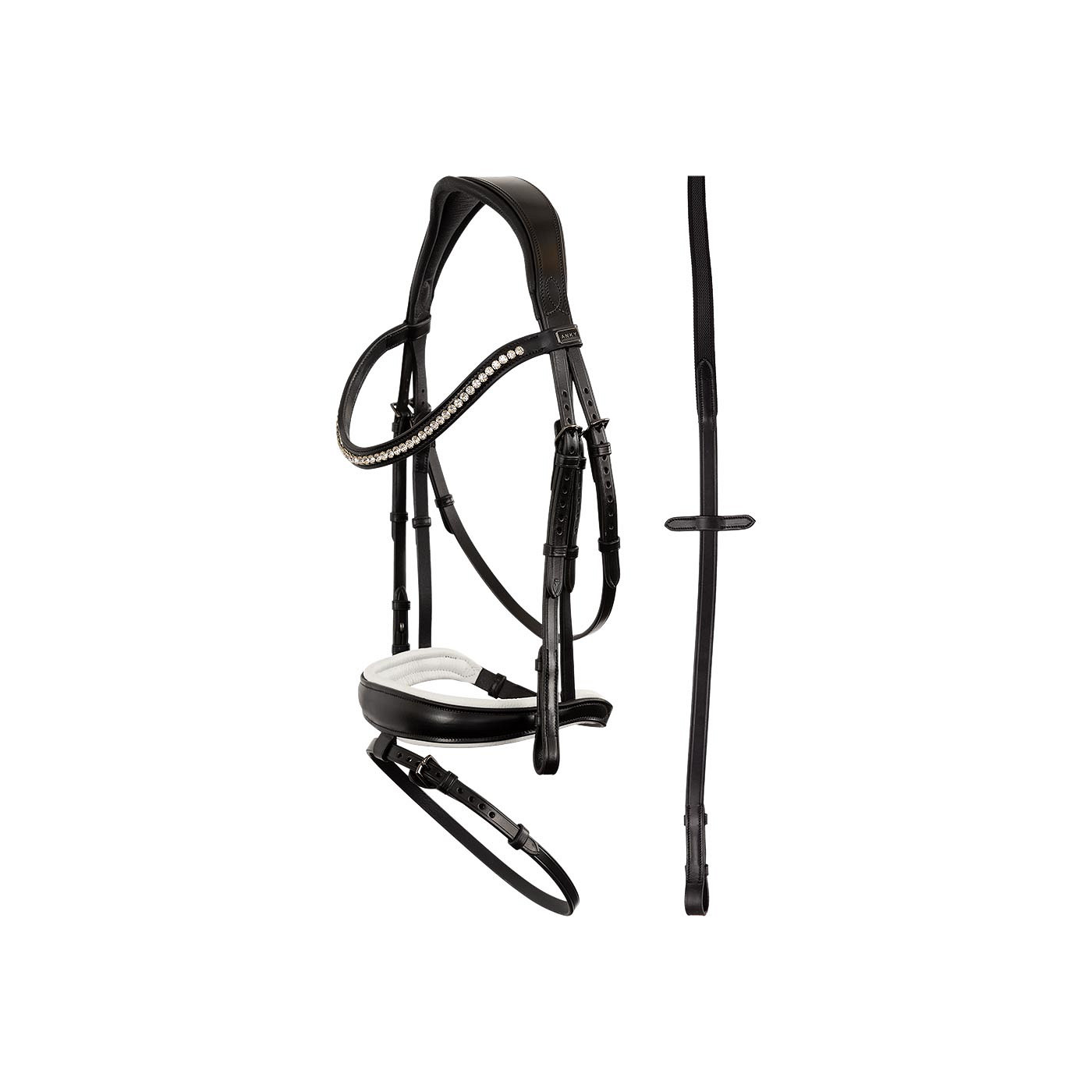 The bridle is anatomically shaped and made of high-quality English Sedgwick leather. The headpiece is extra wide and has a soft padding. The flash noseband with cut-down ends also has a soft padding. The slightly curved browband is inlaid with shiny Stellux™ imitation diamonds in sturdy, silver-coloured cups. The stylish gunmetal buckles have a protective flap. The space between the adjustment holes is 1 cm.