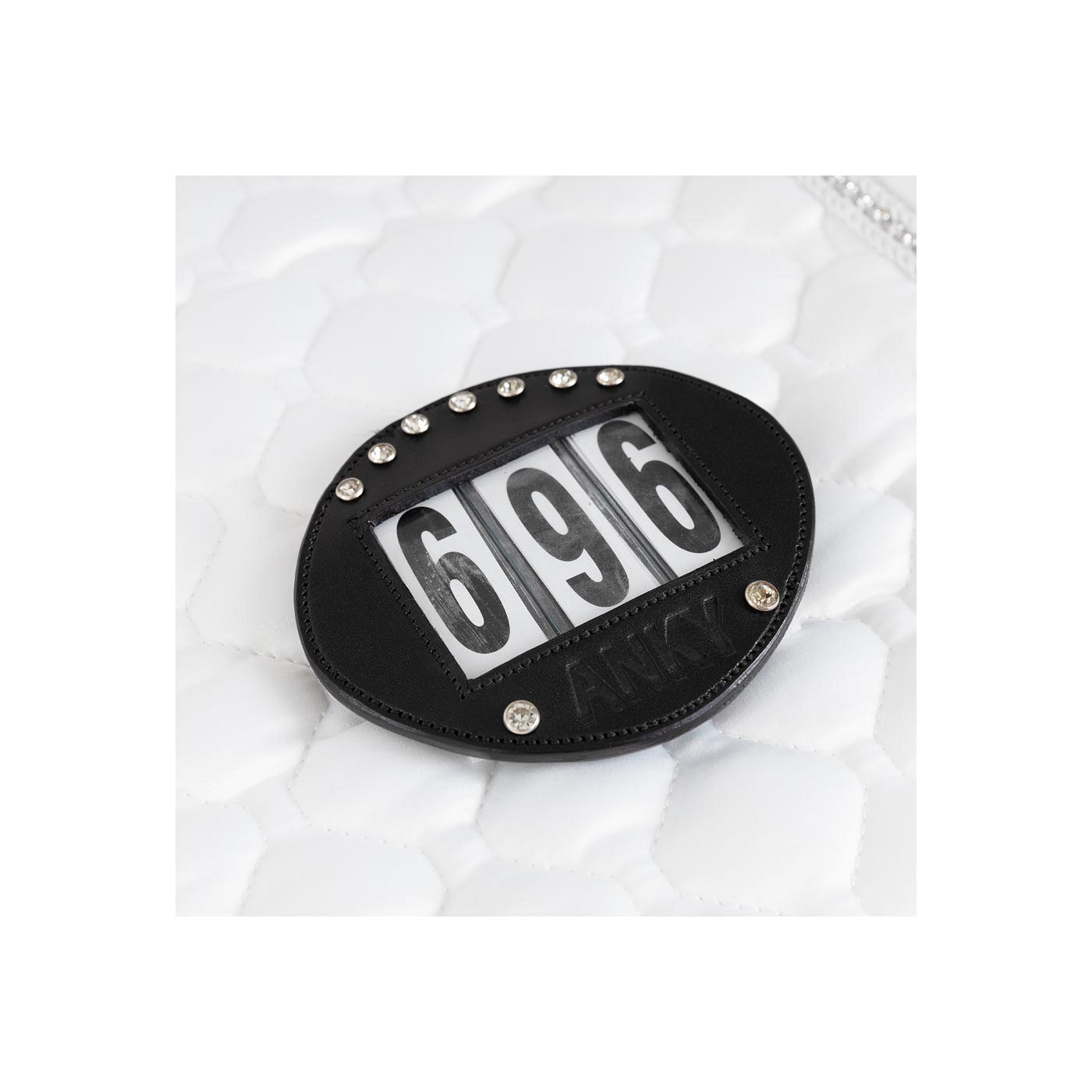 These metal pins and Velcro straps are intended to attach the ANKY leather number holder, art. A81900 to a competition saddle pad.