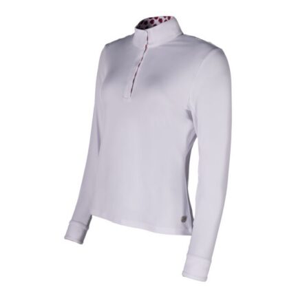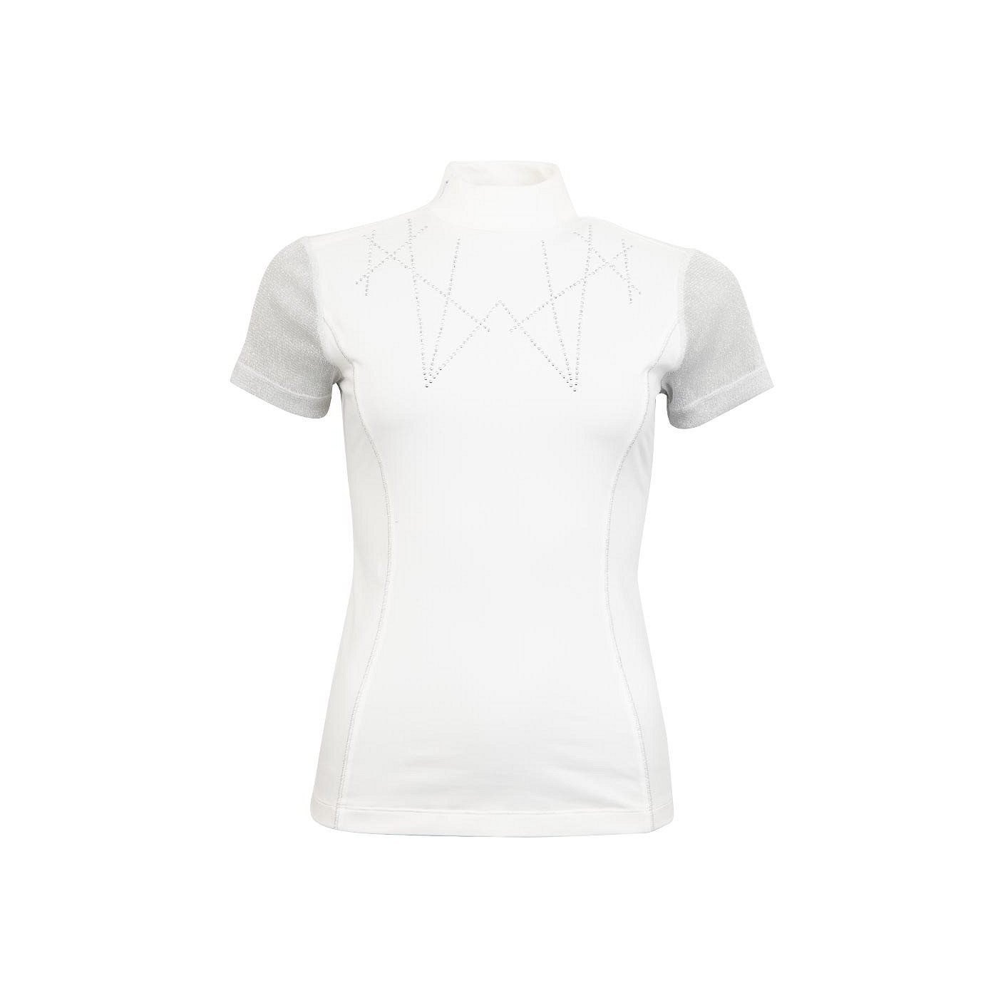 This elegant competition shirt is supple, stretchy and breathable. It features various shiny elements, such as glitter mesh on the upper back panel and sleeves, silver overlock stitching and a graphic pattern formed by rhinestones. The collar has an invisible zipper fastening that runs from the collar towards the right shoulder.