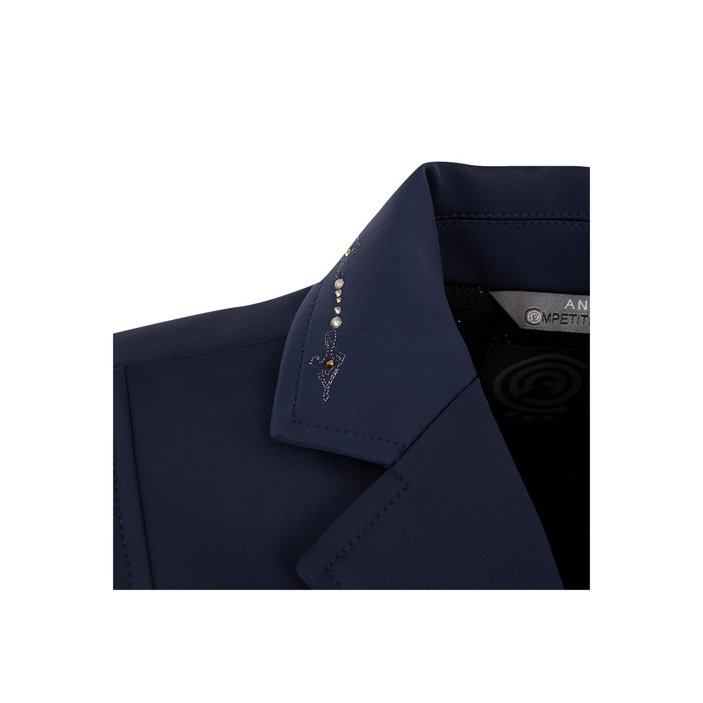 The graceful embroidery combined with rhinestones in different sizes and colours on the collar gives this competition jacket a chic look.