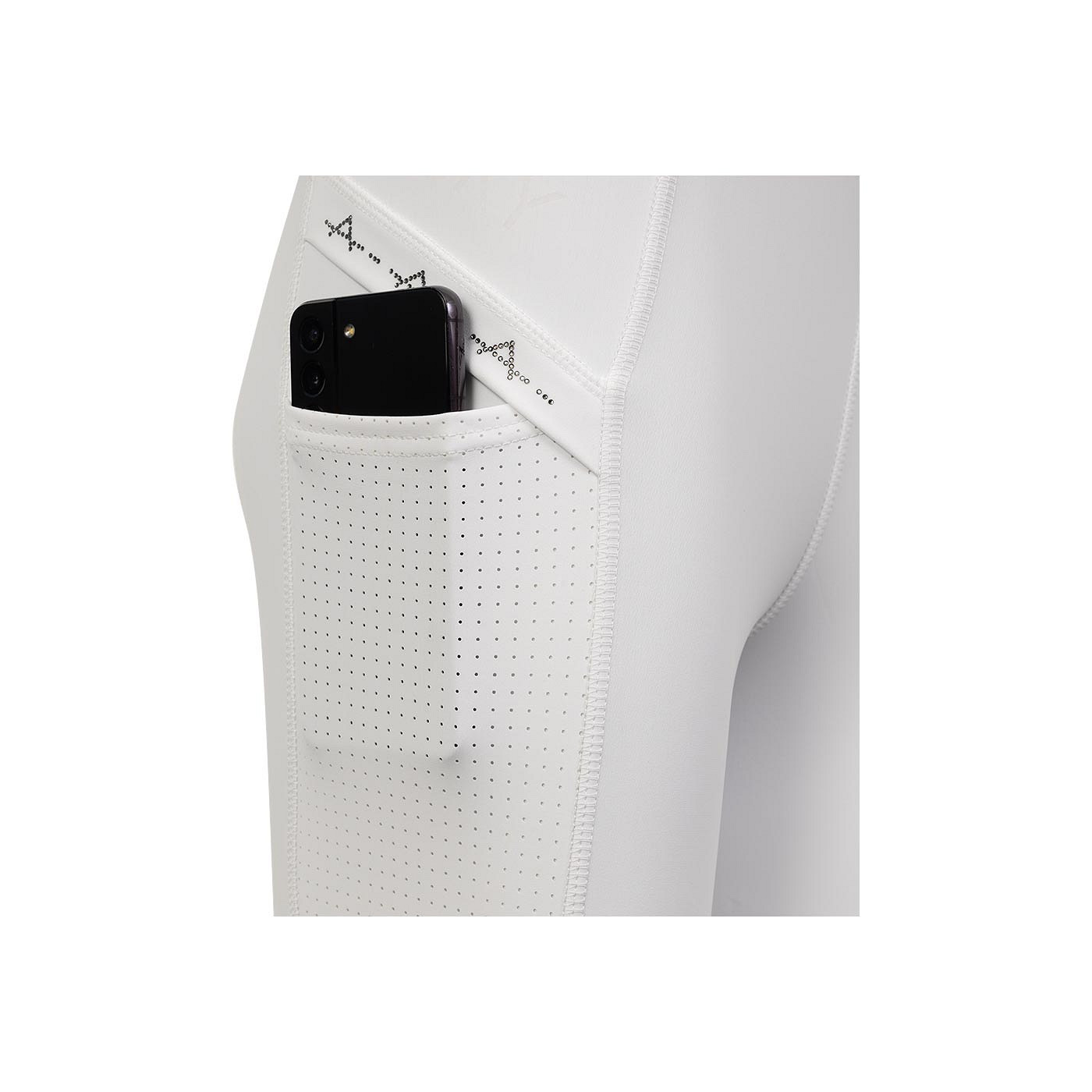 The treggings have two deep side pockets that are breathable thanks to the laser-cut holes. The pockets and back feature the subtle, elegant rhinestone pattern that can also be found on the Exposure shirt. The silicone seat maximises the stability on the saddle.