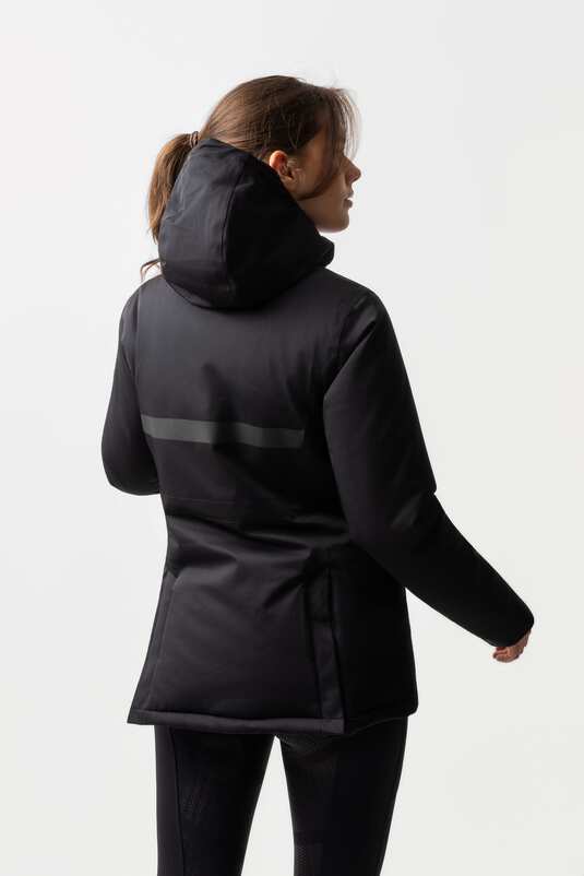 Tagaseljale lisatud magnetkinnitusega lรตhik vรตimaldab mugavalt sadulasse istuda, ilma et need kriimustaksid vรตi kahjustaksid sadulat. Kahesuunaline esilukk ja lukuga taskud tagavad praktilise kasutuse. Peegeldavad detailid seljaosal lisavad nรคhtavust pimedal ajal, muutes ratsutamise ohutumaks. Eemaldatav kapuuts koos elastsete nรถรถride ja trukkidega annab lisakaitset kรผlma ja tuule eest.