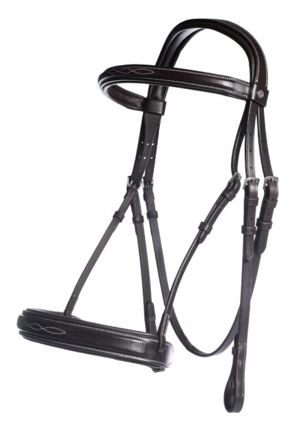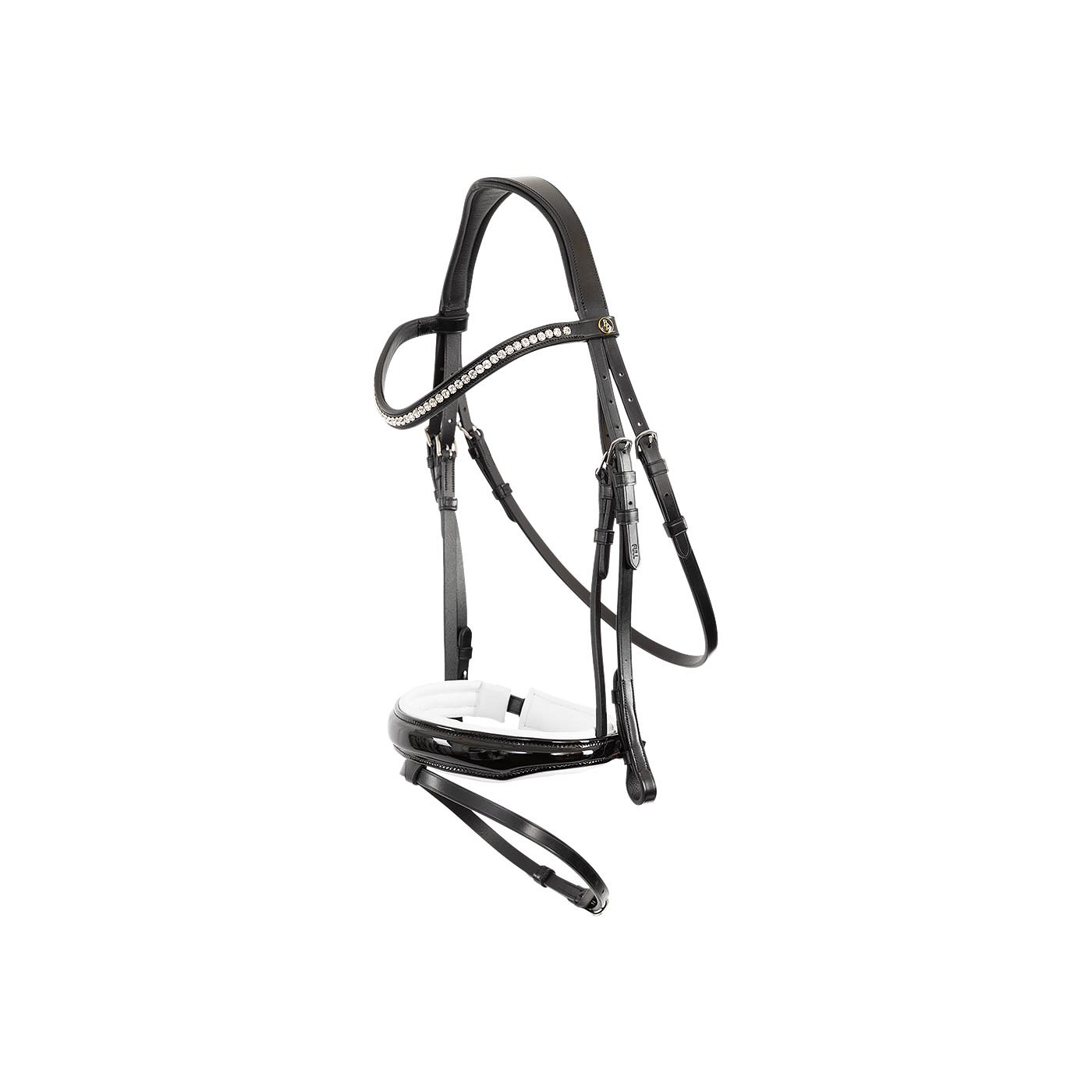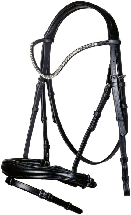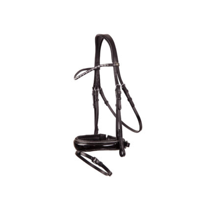 The headpiece and noseband are both softly padded for optimal comfort and anatomically shaped for a good pressure distribution and fit. The browband is inlaid with a chain of luxurious Stelluxโข crystals. The Stelluxโข crystals are fully clamped, making them extra secure. The anatomic crank noseband has an extra thick, pleasant padding and stands out with its luxurious patent leather look.
