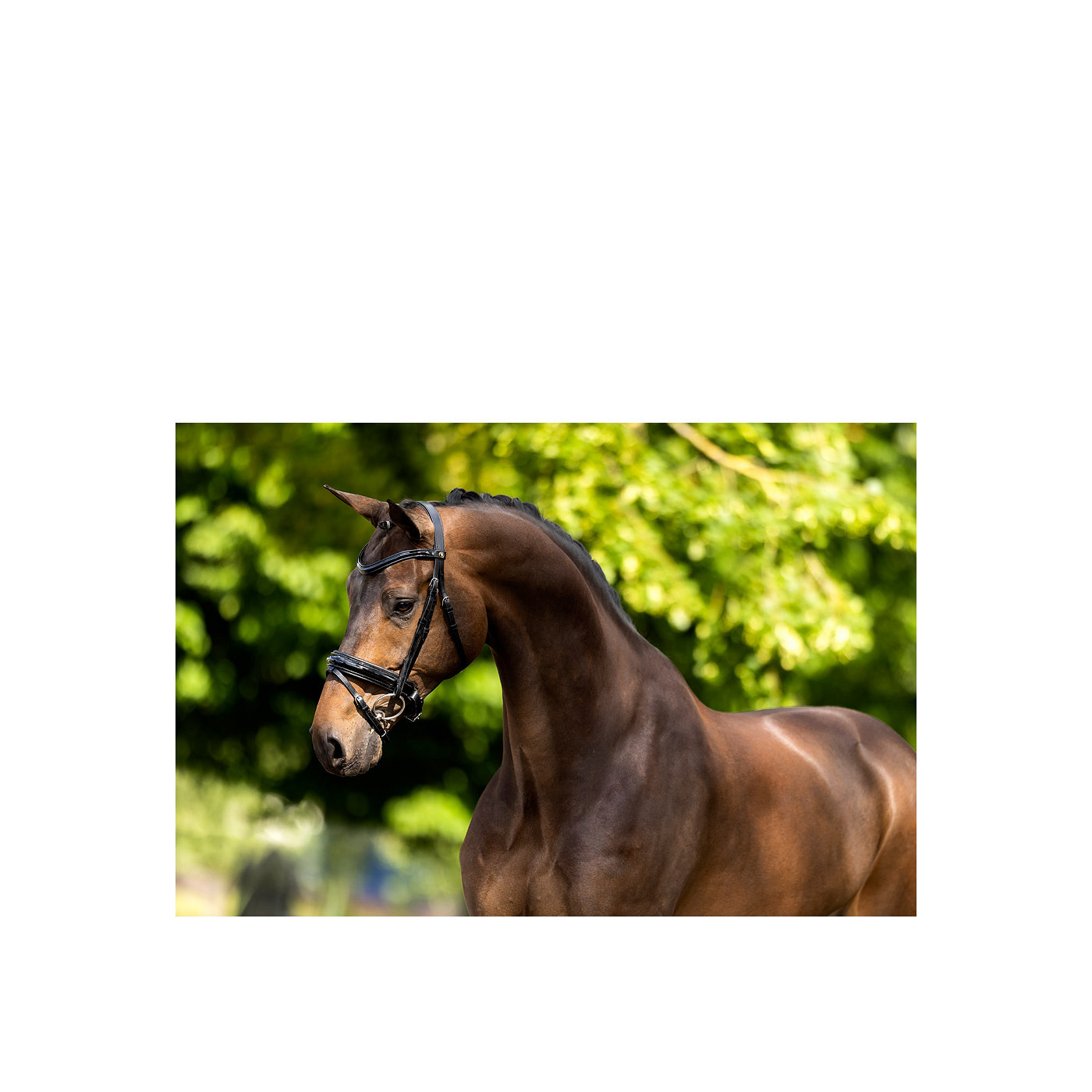 Symmetric bridle with soft padded headpiece. The curved browband is round raised and has a patent leather cover and a soft leather lining. The extra wide (ยฑ 4.5 cm) crank flash noseband with patent leather is round raised, soft lined and has a wide chin pad with soft padded lining. The bridle has a V-shaped flash attachment, hook stud billets and round, shiny silver-coloured fittings. Supplied without reins.