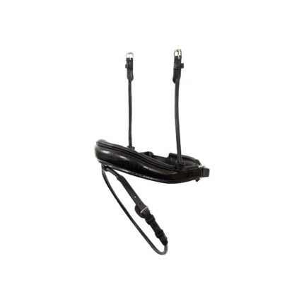 Noseband with a nylon cord on the nose for stronger interaction on the nose than with regular leather nosebands. It also reduces the horse desire to open his mouth. Suitable for bridles with the noseband strap going over the crown. The black noseband features shiny, silver-coloured buckles and the Tobacco noseband features matte, brass-coloured buckles.