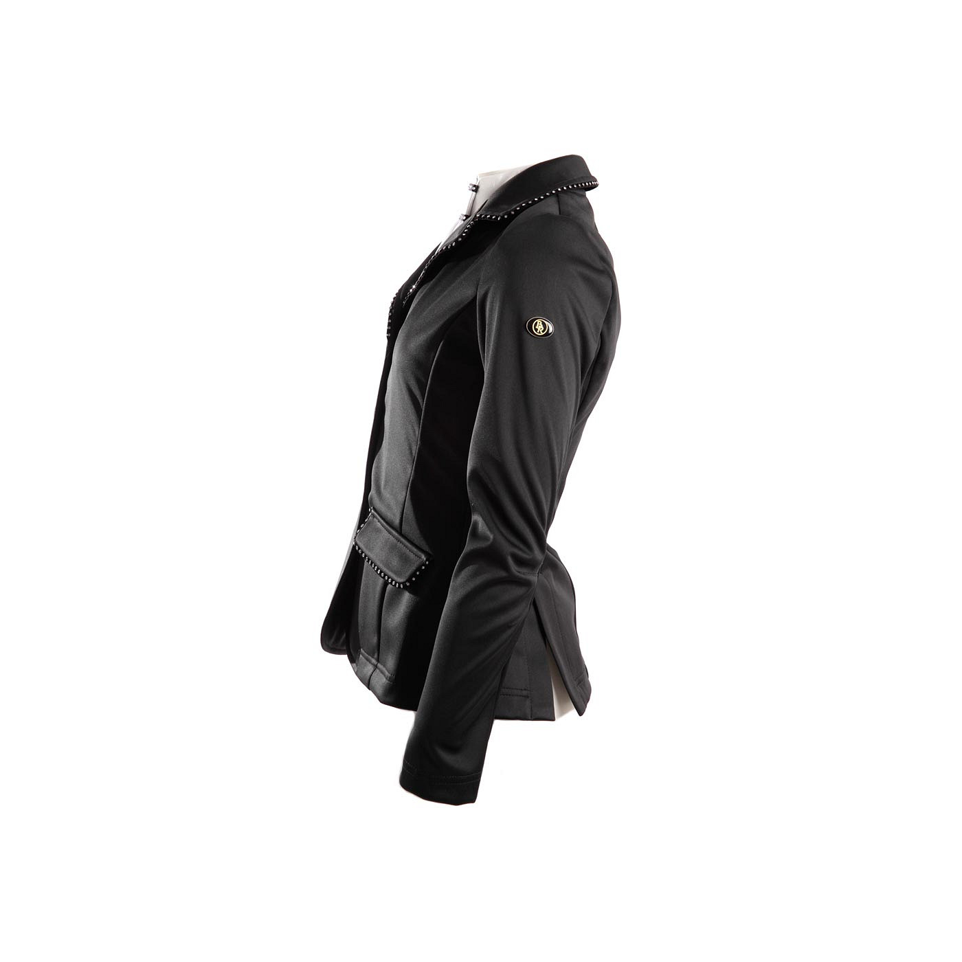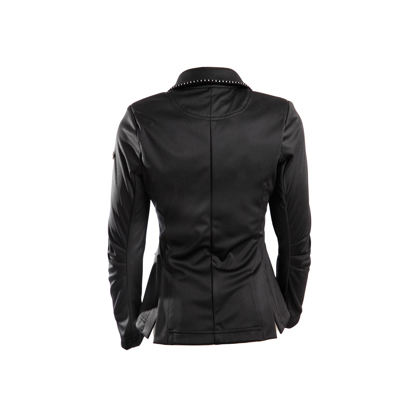 Stylish fitted competition jacket, fitted with two riding slits at the back. The jacket features comfortable stretch material and has been fitted with a subtle piping with imitation diamonds at the collar and lapel. The flaps at the pockets at the front have been fitted with the same piping with imitation diamonds. The sleeves have a comfortable fit with extra room at the elbow, which improves comfort when riding. The competition jacket has been fitted with star design buttons. Three extra buttons, matt silver with a horse’s head, are provided. Materials: 100% polyester, soft shell.