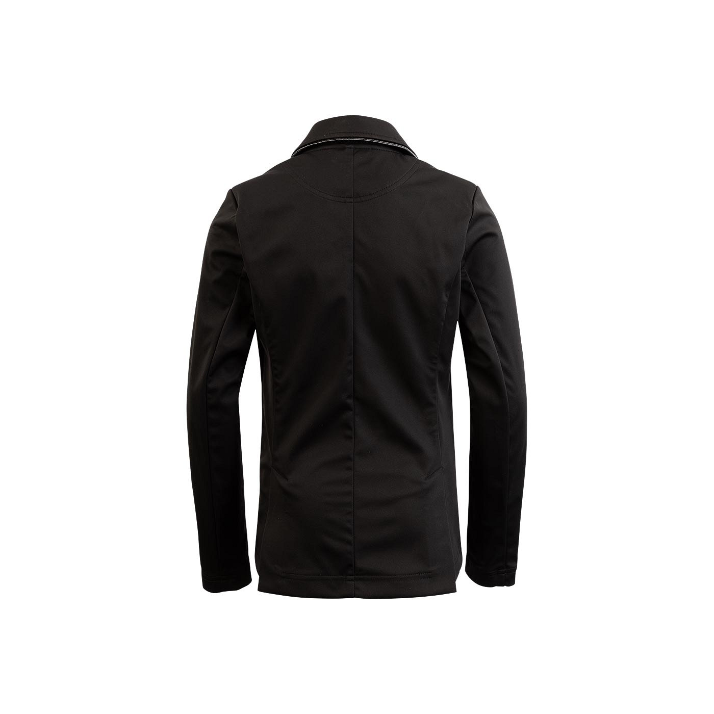 This beautiful competition jacket for children is not only pleasant to wear, but also looks stylish because of the black and shiny piping along the collar and above the pockets and the black glitter buttons.