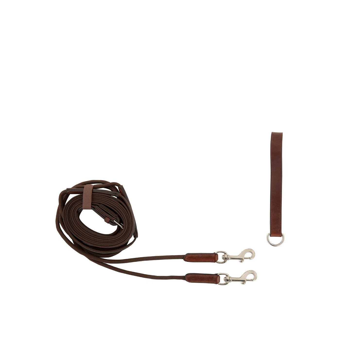 The ends of these draw reins are made of nylon cord (8 mm wide). A great advantage of cord is its smooth surface, which allows the reins to slide easily through the bit rings. The parts that are held by the rider are made of webbing with rubber threads woven through (14 mm wide). The cord ends attach to the girth by means of snap hooks. The draw reins come with a leather girth loop with D-ring, which can be used if the girth does not have a ring of its own. The draw reins feature shiny, silver-coloured fittings made of chrome-plated brass. Draw reins allow the rider to obtain a correct position of the horseโs head. If the horse overextends its head, the draw reins will put pressure on the bit, which will subside when the horse gives way. Size Cob: 0.95 m webbing + 1.125 m cord = 2.075 m (4.15 m total length) Size Full: 1.3 m webbing + 1.2 m cord = 2.5 m (5 m total length)
