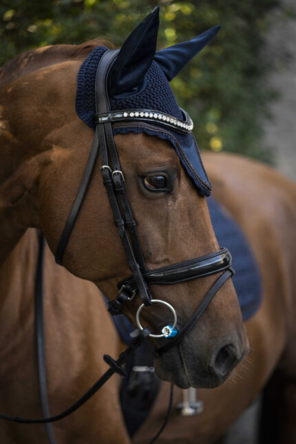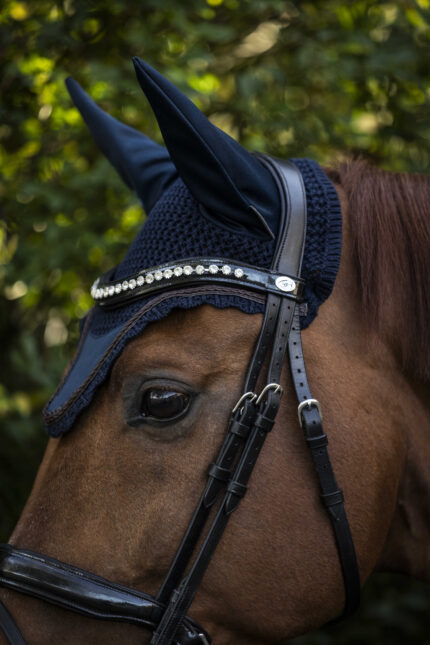 This bonnet is crocheted, which allows for optimal ventilation, and features neoprene ears. Neoprene has a noise-muffling effect, making the bonnet especially suitable for young and nervous horses. The ear bonnet is decorated with shiny studs.