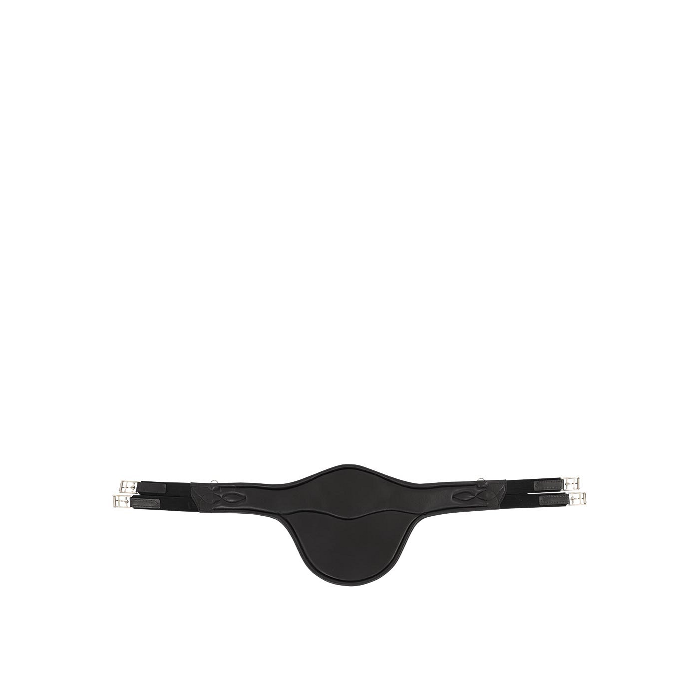 The stud guard provides optimal protection of the horse’s belly while jumping and the anatomical design of the girth ensures optimal freedom of movement. The girth contains elastic inserts at both ends and elegant stainless steel roller buckles. The elastic inserts offer extra comfort and this makes it easier to girth your horse. In the middle there is a snap hook and on the sides there are two small D-rings for the attachment of auxiliary reins. The playful decorative stitching completes the belt in an elegant way.