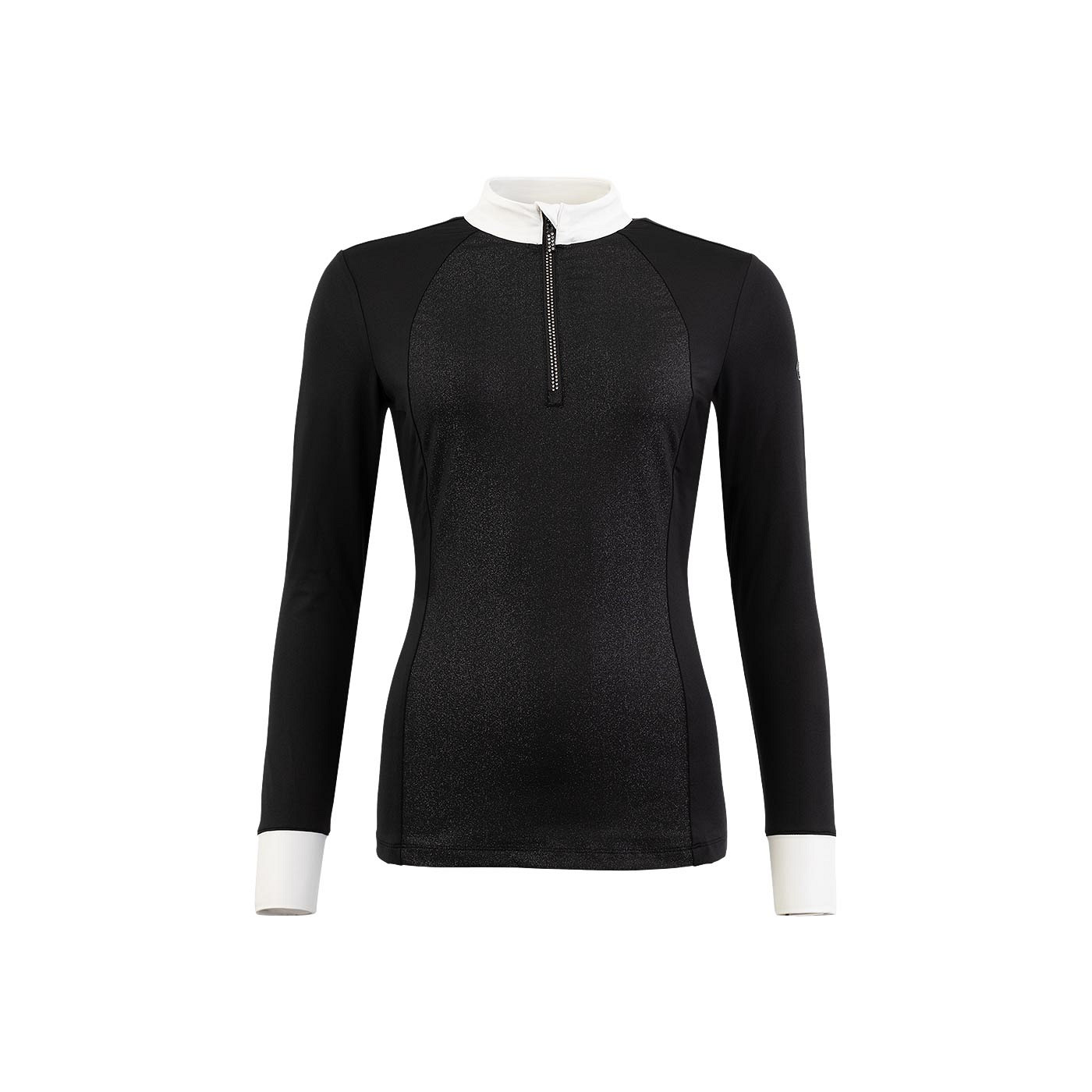 This elegant competition shirt will make you shine during your competitions. The long-sleeved shirt features a subtle glitter print on the front and is finished with rhinestones along the half-length zip. The half-length front zipper features a zipper protector and on the left sleeve there is a graceful silver-metallic BR logo. The shirt feels supple and in addition, the fabric is quick-drying and moisture-wicking so you stay dry and fresh while wearing it.