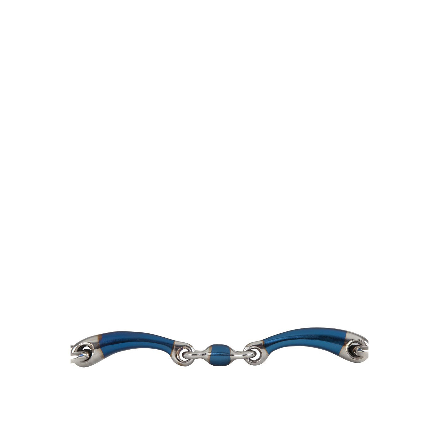 This double jointed loose ring snaffle is made of solid stainless steel rings and a mouthpiece of mild steel combined with a layer of sweet iron on the mouthpiece (blue). The sweet iron stimulates the chewing process and saliva formation. When this material reacts with moisture, warmth and air in a process called oxidation, the surface rust tastes sweet. As a result, the horse will be more willing to accept the bit. The blue colour disappears eventually, but the taste of the surface rust remains.