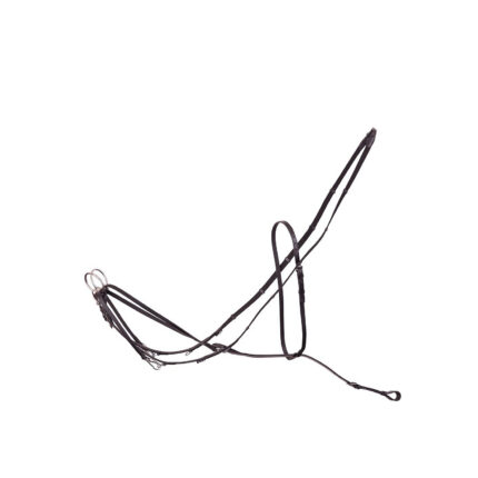 Leather Market Harborough (also known as German martingale or Thiedemann reins) with an adjustable neck strap. Attaches to the girth by means of an adjustable girth loop with detachable carabiner. The narrow straps of the running martingale are adjustable as well and fitted with snap hooks. The rubber rein (21 mm wide) has leather ends (15 mm wide) with buckles. The rein has three D-rings stitched on both sides: two on the leather ends and one on the rubber part. The narrow martingale straps are passed through the bit rings and attached to the D-rings of the rein by means of carabiners. The Market Harborough features shiny, silver-coloured fittings made of chrome-plated brass. This training aid prevents the horse from extending its head too far upwards or ahead when riding.
