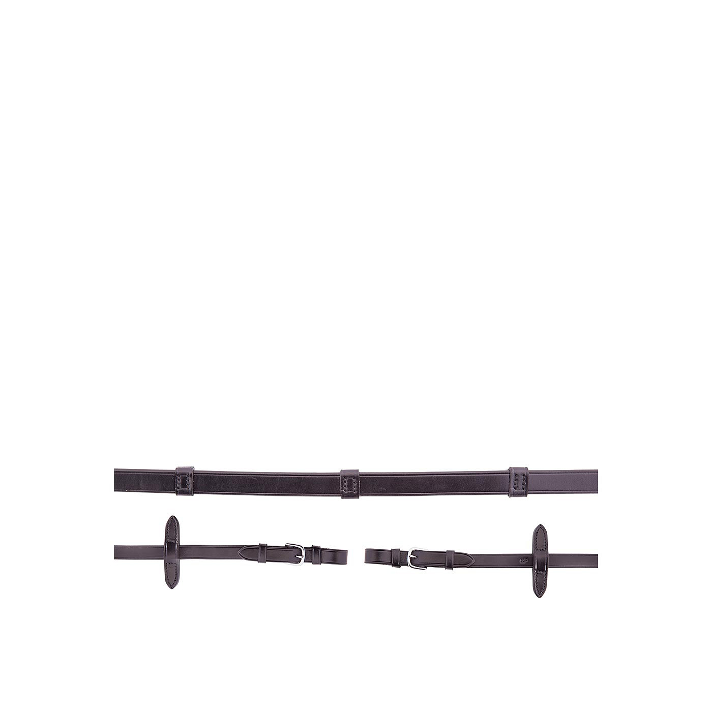 Leather reins with leather hand and rein stops and round buckles, 16 mm.