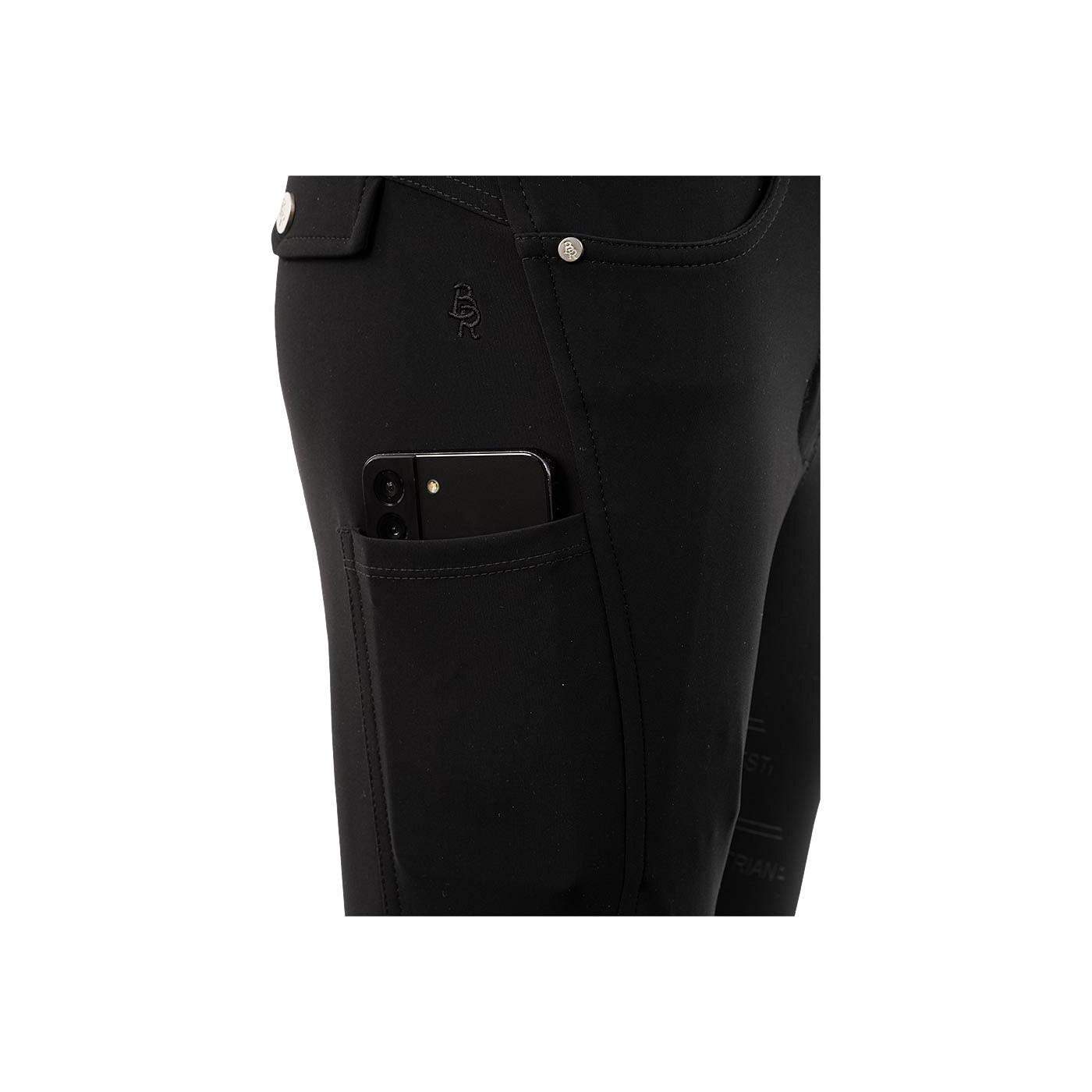 The silicone seat with stylish BR pattern provides extra grip and a stable seat. The deep side pockets next to the gracefully curved seam are suitable for storing a smartphone. In addition, the breeches feature two pockets on the front and two fake flap pockets with a glossy BR button on the back. The breeches stylishly feature the BR logo on the back and a metal accessory on one of the belt loops.