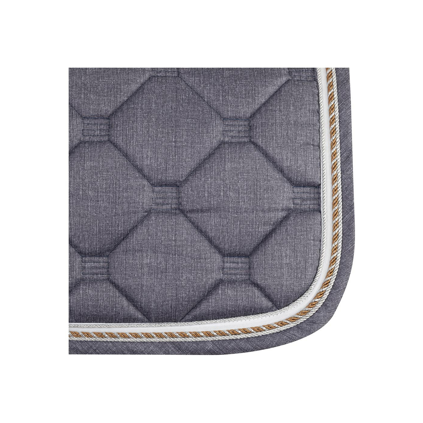 Stylish saddle pad made of blended polycotton with an airflow backseam to stimulate airflow. The saddle pad has a 400 g filling with 8 mm foam and a Ciba treated (moisture control) polyester airflow lining. The saddle pad has a special binding with airflow polyester and threefold cord piping with silver details. The retaining straps and girth loops have Velcro closure.