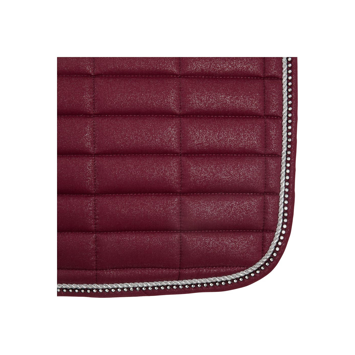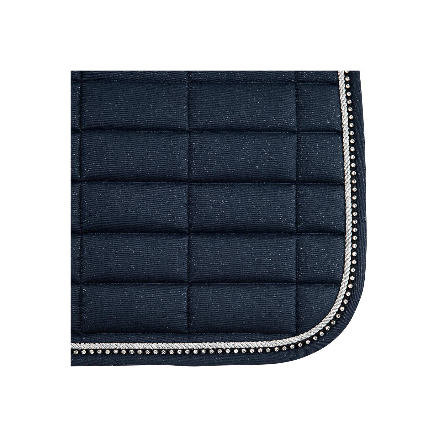 Chic, preformed saddle pad made of polyester cotton with a polyester Airflow lining. The saddle pad has a filling of 300 g polyfill and 10 mm foam. With square quilting, 10 x 5 cm. The saddle pad has been decorated with silver-coloured cord piping and piping with imitation diamonds. The girth loops and retaining staps have Velcro closure.