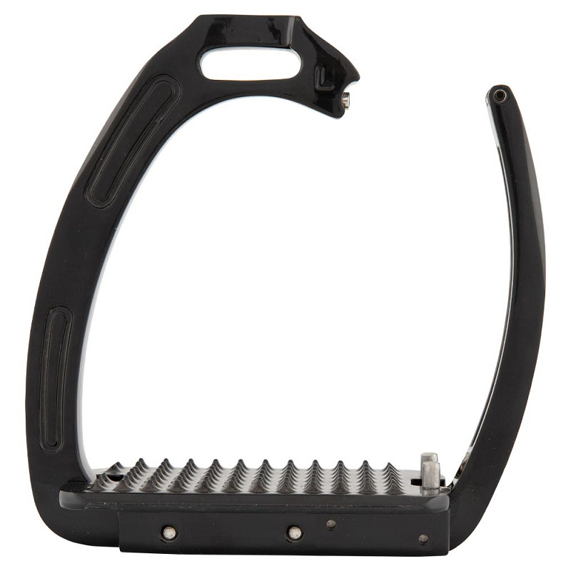 This stirrup is made of galvanized aluminium with a powder coating and is reinforced with stainless steel on the inside for extra strength. The stirrups feature a magnetic safety mechanism. The weight of the rider will open the magnetic clasp in the event of a fall. This way, the safety mechanism helps to prevent the foot from getting caught in the stirrup. As soon as the foot has come free, the clasp will automatically spring back into position. The slightly curved opening for the stirrup leather ensures a good stirrup position, which will keep the foot in the correct position. As a result, this provides more stability and improves leg position.