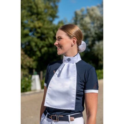 The stock tie is extremely practical to use, does not need to be folded and the use of a stock pin is also unnecessary. The stock tie is easy to attach to the collar of the competition shirt or the competition blouse by means of the Velcro closure at the back.